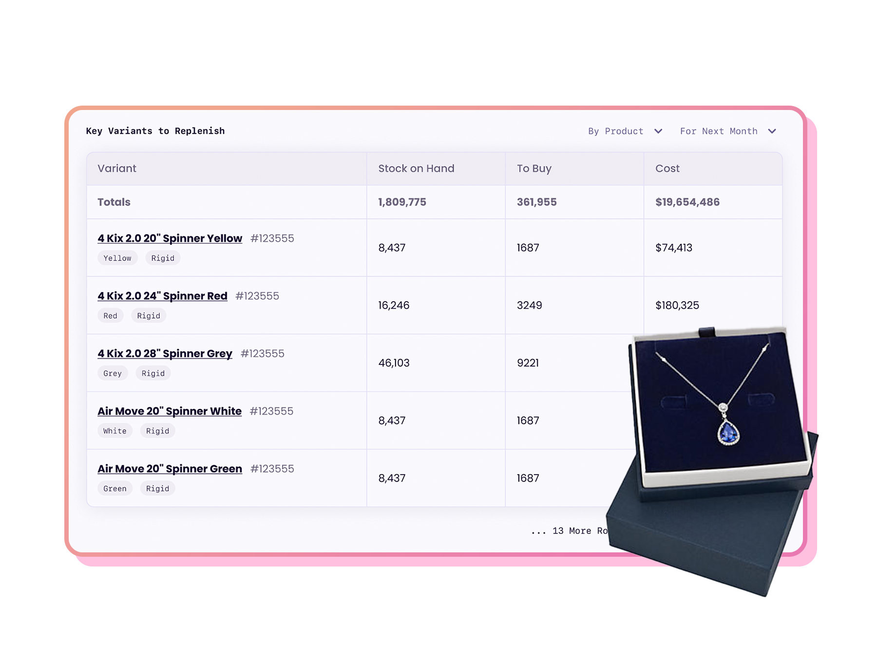 Master the complexity of jewelry portfolios and price tier planning. Our AI understands metal types, stone combinations, and regional preferences that basic planning systems miss, optimizing your mix down to the style-material-size level.